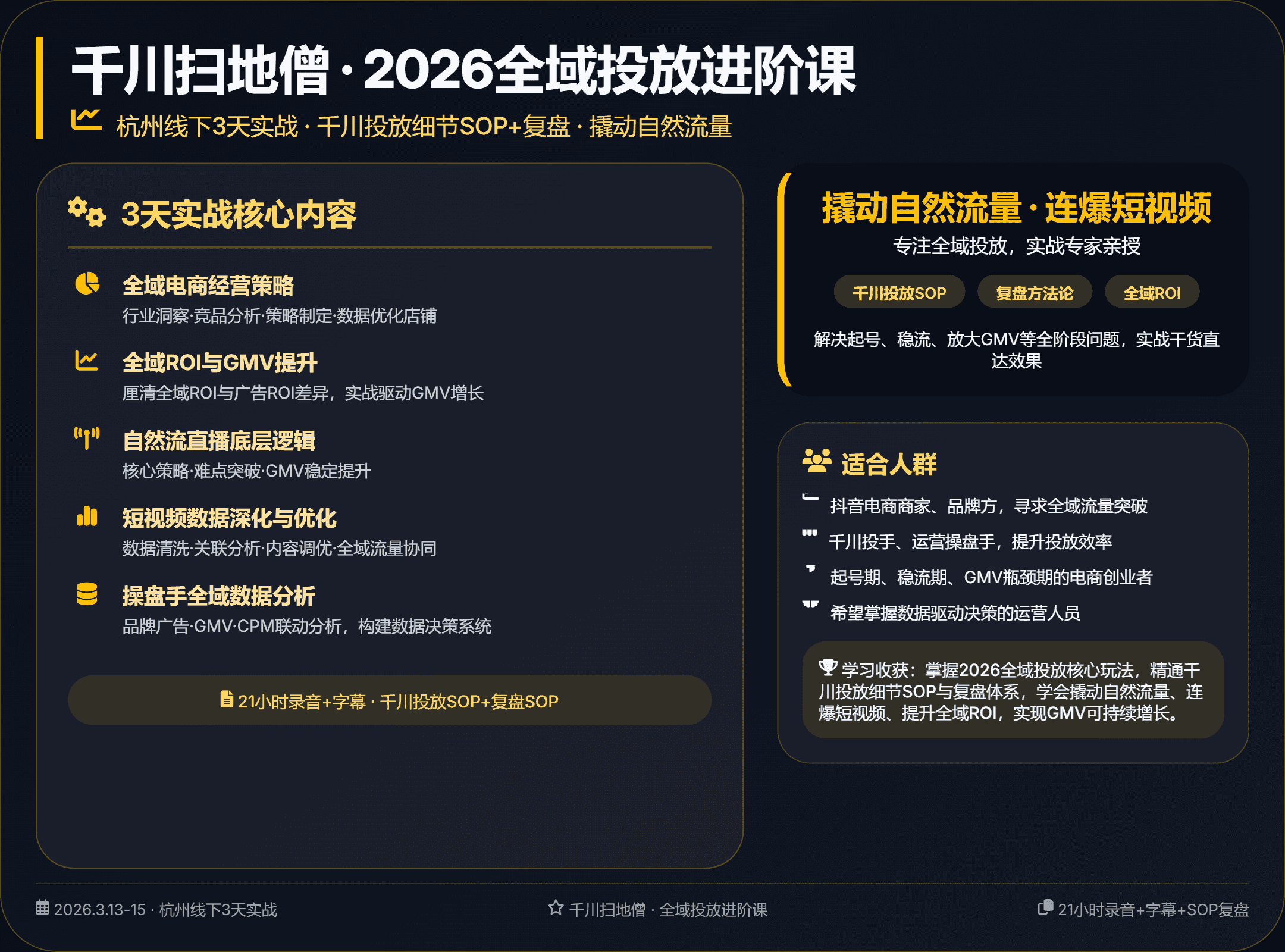 【21494】千川扫地僧2026全域投放进阶课:杭州线下3天实战,千川投放细节SOP+复盘,撬动自然流量