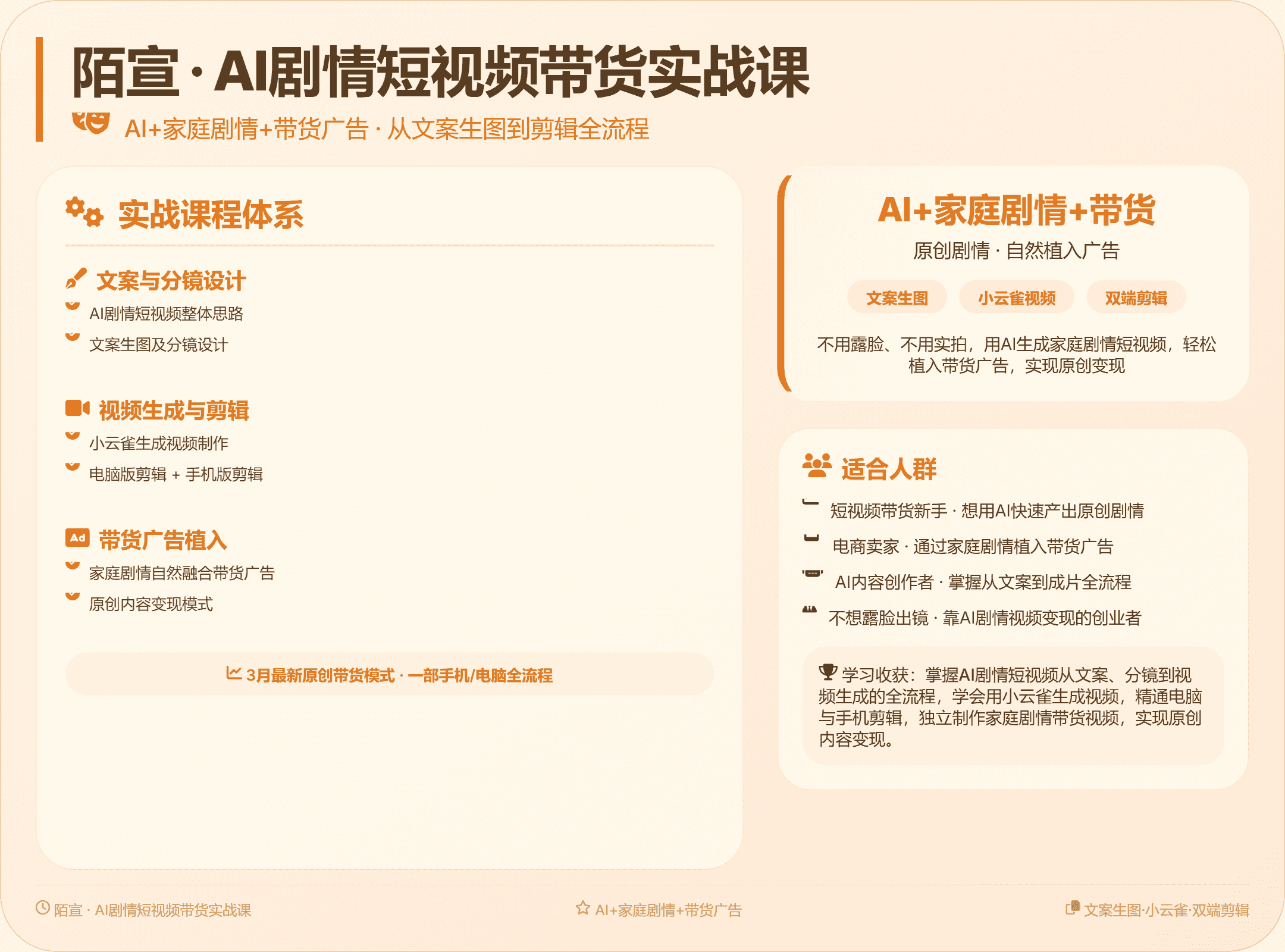 本课程是一套3月最新原创AI剧情短视频带货实战课,聚焦“AI+家庭剧情+带货广告”的原创带货模式。课程系统讲解AI剧情短视频整体思路、文案生图及分镜设计、小云雀生成视频制作、电脑版剪辑与手机版剪辑等核心模块。通过AI生成家庭剧情类短视频,自然融入带货广告,帮助学员掌握从文案、生图、视频生成到剪辑的全流程,实现原创内容带货变现。