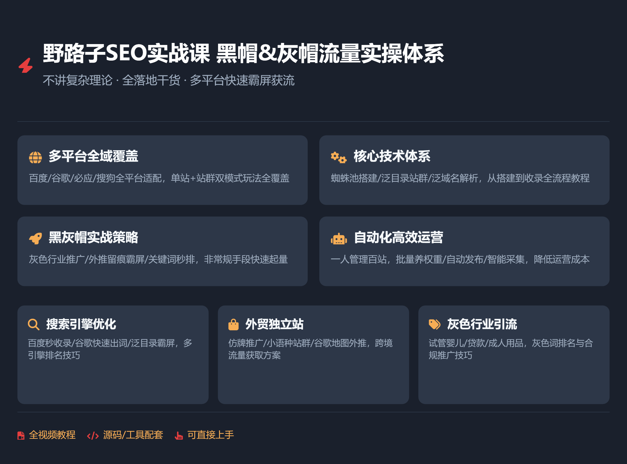 这是专门钻研“野路子”的SEO实战课。不讲复杂理论,只教能快速出效果的操作方法。内容涵盖百度、谷歌单站与站群玩法,从蜘蛛池搭建、泛目录站群、快速收录排名,到灰色行业推广、外推留痕霸屏等技术。课程主打黑帽与灰帽策略,全是可直接上手的干货教程,适合想通过非常规手段在短期内获取流量的实操者。