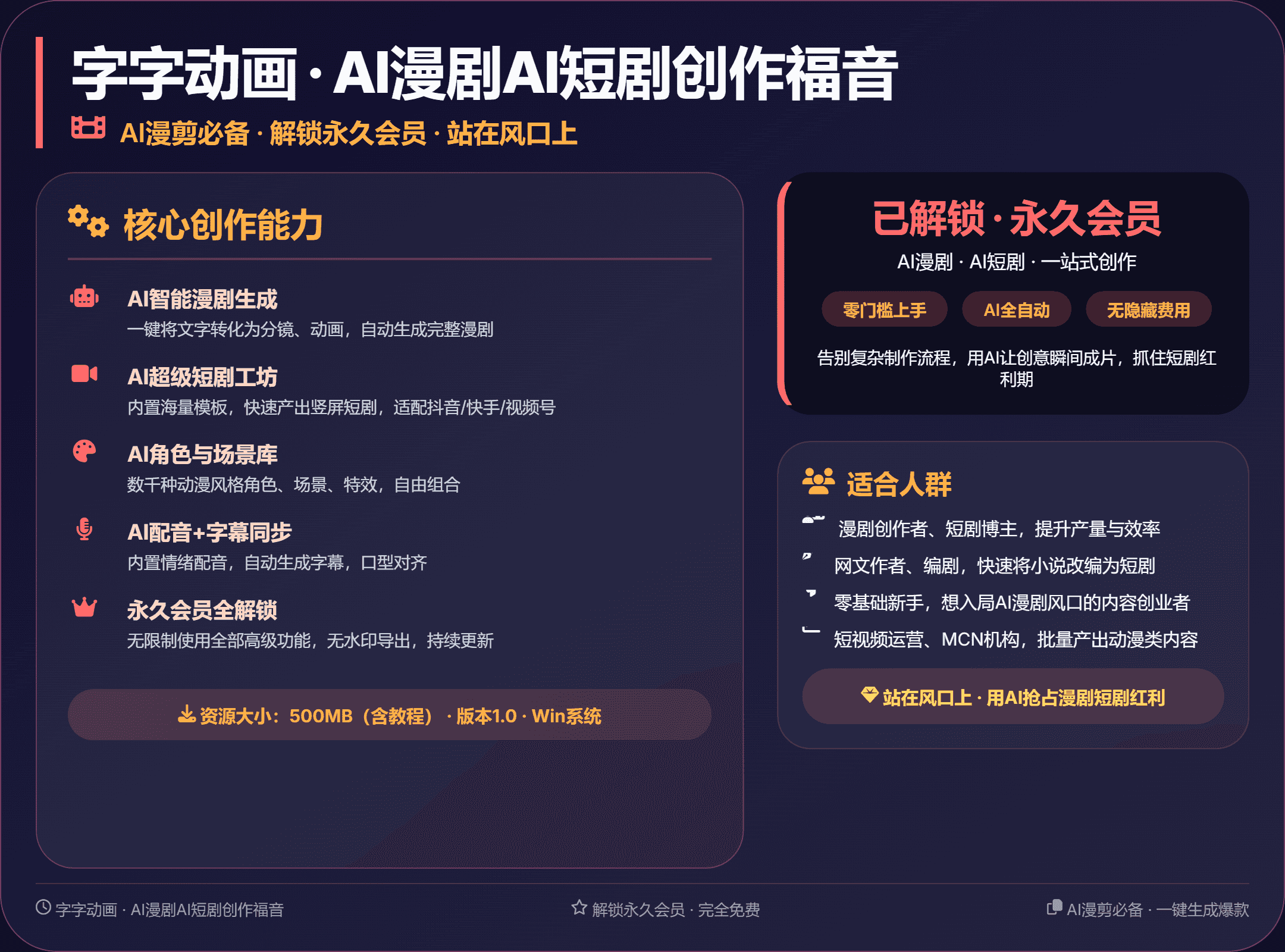 AI漫剧必备AI超级短剧 已解锁永久会员【资源名称】:字字动画