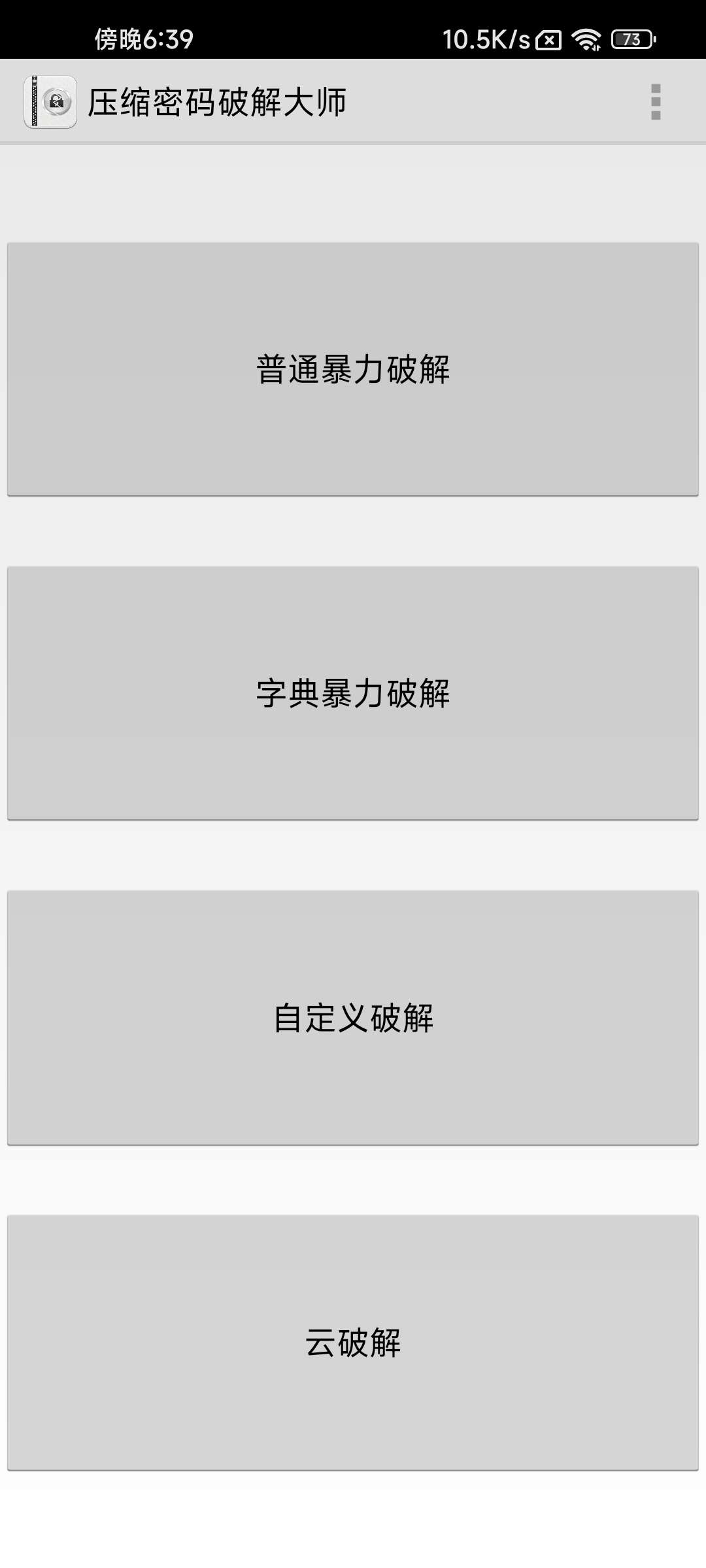 一款暴力解密压缩包字典app,可自动跑字典解密、自动清除加密压缩包密码、zip/rar等格式压缩包强行解密解压缩等功能,让你从此解压文件不受限制。支持自定义解密密码典,支持设置解密密码位数是否包含大小字母/符号/空格等,支持云解密
