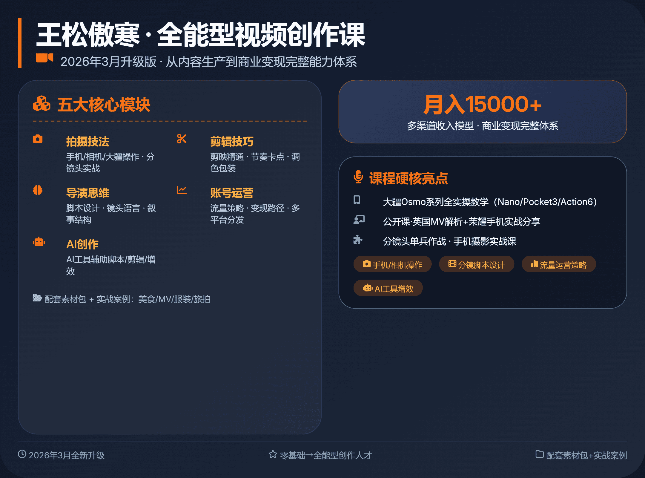 【21491】王松傲寒全能型视频创作课-26年3月更新课:从内容生产到商业变现的完整能力体系,多渠道收入月赚15000+